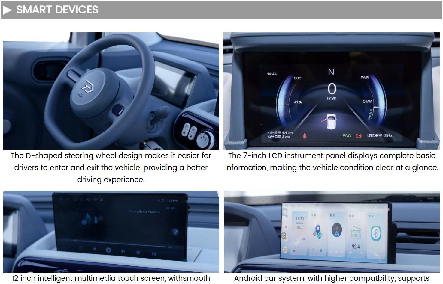 B1 este o masina electrica cu 2 locuri moderna (din categoria L7e-CP) cu dotari premiumfranare regenerativa, display LCD, conexiune bluetooth, wi-fi, directie asistata, frana asistata electric, ABS, EBD, Airbag, geamuri electrice, aer conditionat, camera video marsarier si senzori de parcare, oglinzi cu reglaj electric, senzori presiune roti, asistenta la urcare, ISOFIX, garantie baterie 4 ani.